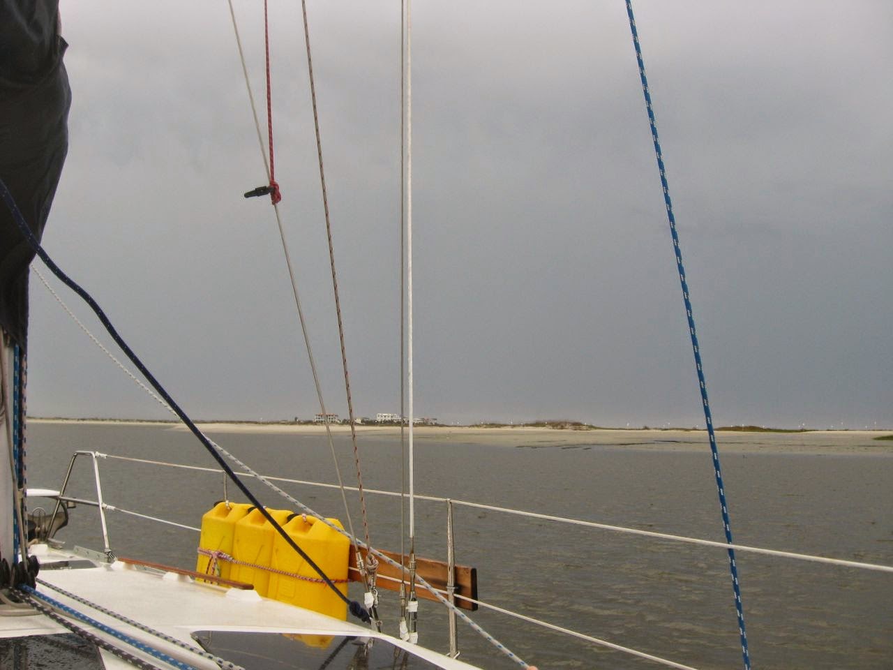 Oups, en voulant éviter un banc de sable, nous avons coupé trop tôt une bouée rouge, résultat, nous nous sommes échoués :( Tentant de nous déprendre par nous même, voyant le mauvais temps qui arrivait à grand pas derrière nous, nous n'avons donc pas eu le choix que de faire affaire avec "BoatUS" dont nous sommes membre. Service rapide, courtois et professionnel. Sans aucun dommage au voilier, nous repartons et nous nous préparons à affronter la dépression qui nous rejoint rapidement. Dans les minutes suivantes, Léane nous informe par radio VHF qu'il vienne de subir une pointe de vent à 45 noeuds.